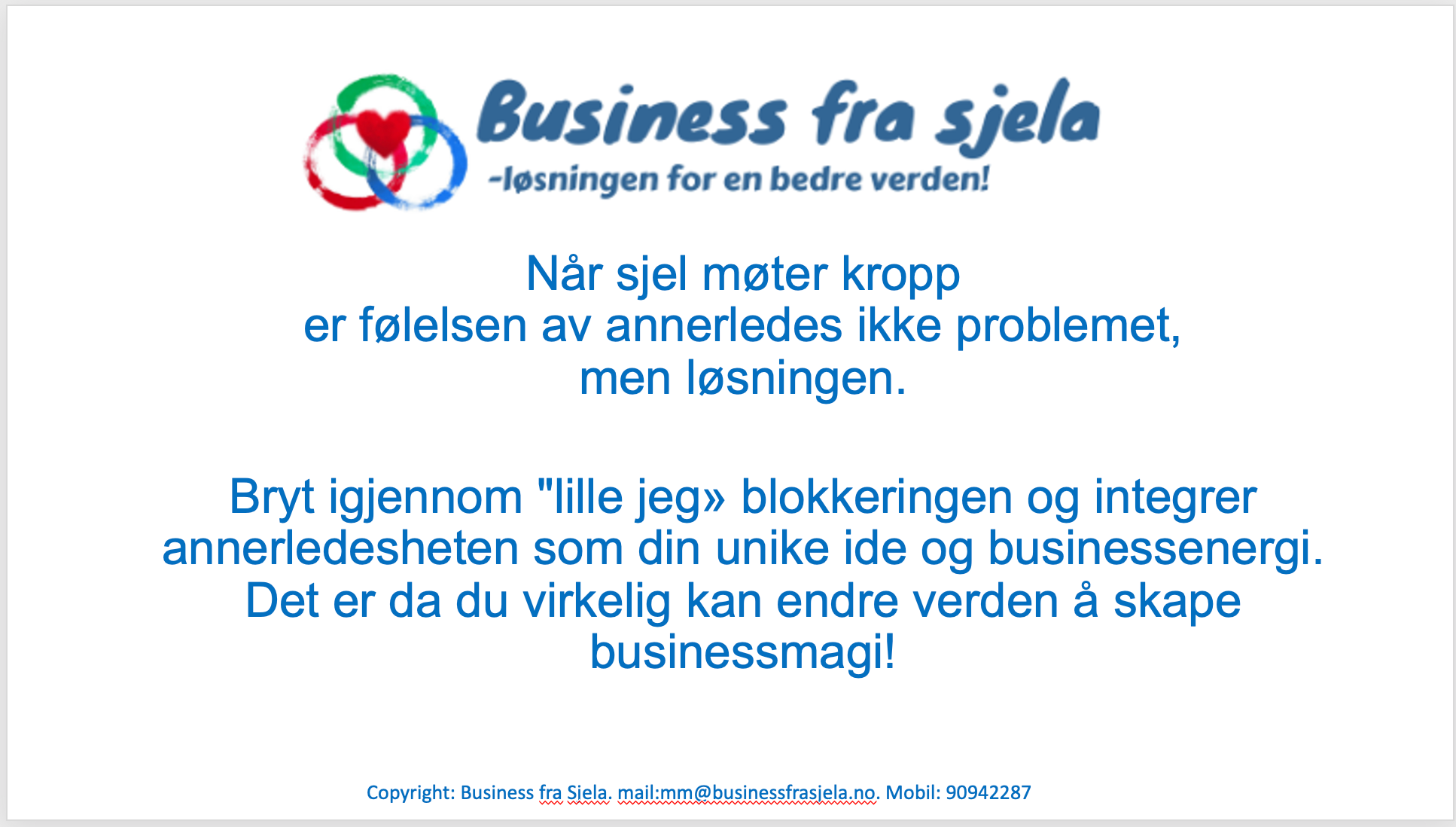 Så ærlig, rett på sak og dypt har jeg sjeldent jobbet. Mette-Marit har en helt unik måte å kommunisere sjel til sjel, så du forstår også med hodet og i kroppen hva sjelen din prøver å fortelle deg, for så å bli gjenforent med din egen livsplan. Dette er for oss som brenner for å bidra til en bedre og høyere vibrerende verden med businessen vår.